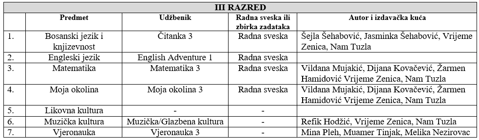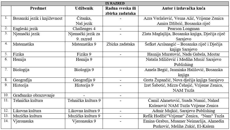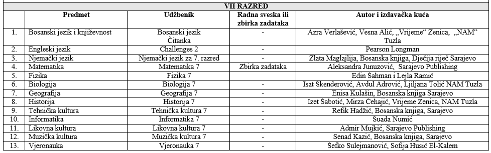 Za VII razred nabavljeni su sljedeći udžbenici: Čitanka 7, Naš jezik 7, Historija 7, Biologija 7, Geografija 7 i Informatika 7.
