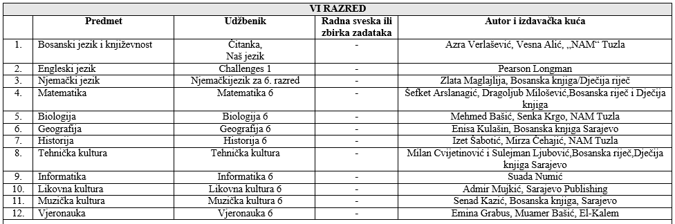 Za VI razred nabavljeni su sljedeći udžbenici: Čitanka 6, Matematika 6, Biologija 6, Historija 6 i Informatika 6.